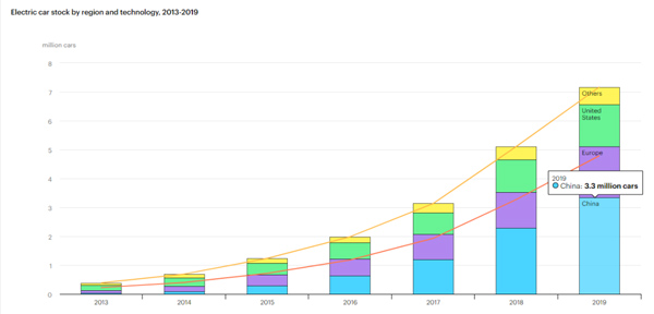 The global stock reached 7.2 million in 2019, with China claiming 47% of all electric cars on the road – up from just 8% in 2013.
