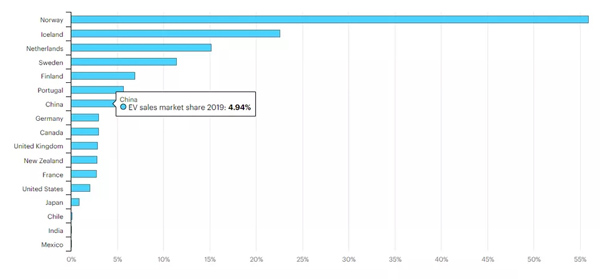 Electric car sales topped 2.1 million globally in 2019, surpassing 2018 – which was already a record year. Sales rose 6% from 2018, following several years of over 40% annual electric car sales growth. The 2019 increase is embedded within the third year of global car market contraction, and the global electric car market share reached a new record of 2.6%, up from 2.4% in 2018 and 1% in 2017. The electric car stock therefore increased 40% year-on-year in 2019, indicating strong sustained EV sector development after annual successes since 2016 and a positive outlook for attaining the 36% average annual stock growth needed to reach the SDS target by 2030. China was the world's largest market (1.06 million electric cars sold in 2019), followed by Europe (560 000) and the United States (326 000); these three regions accounted for over 90% of all sales in 2019. Norway continues to have the highest market share for sales (56% in 2019), followed by Iceland (23%) and the Netherlands (15%). Battery electric cars (comprising battery electric cars and plug-in hybrid electric cars) made up a larger portion of electric car sales (almost three-quarters) in 2019. Progress in decarbonizing the power sector will accelerate the CO2 emissions reduction benefits of EVs.