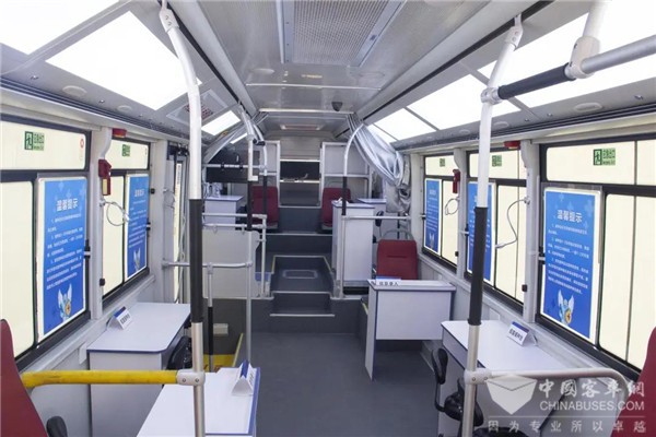 The interior of the vehicle resembles that of a bus, but with fewer seats.