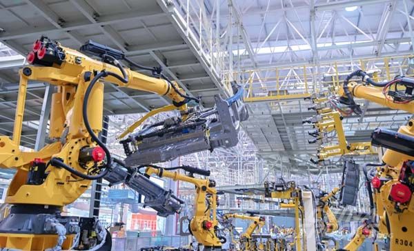 The welding workshop features hundreds of robotic arms operating simultaneously. Each robot performs stretching, rotating, gripping and welding tasks under centralized system control.