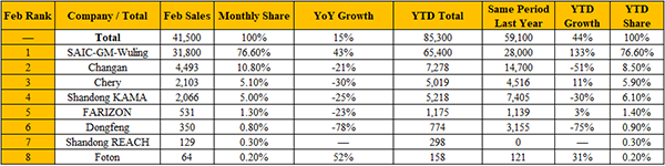 - China’s Mini Truck Sales Rise 15% in February to 41,500 Units